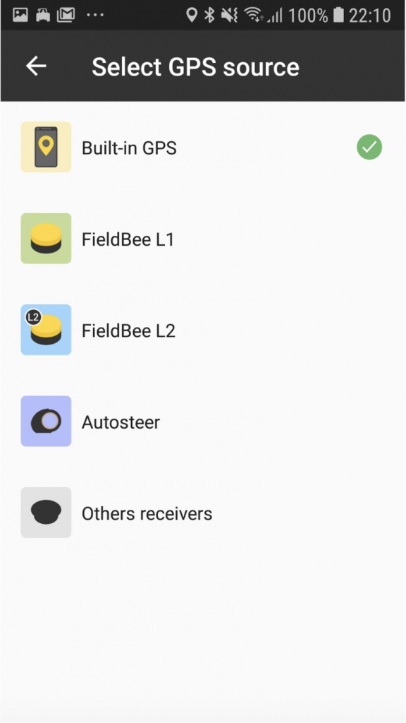 In the last app release the more convenient menu for connecting to the required GPS source was implemented. That makes connection to the antenna faster and easier. Firstly, using this new menu farmer can select the antenna he has (FieldBee L1 or L2).